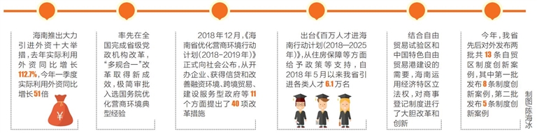 针对引进外资等领域存在的问题,海南推进大力引进外资十大举措,设立海南国际经济发展局,建设国际投资“单一窗口”以及具有海南特色的国际贸易“单一窗口”等。
