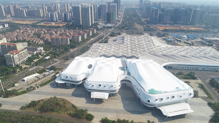 日前俯瞰海南国际会展中心,其会议中心的顶部维护工作已接近尾声,目前正进行最后一道保护涂层粉刷工序,预计本月可完成维护工作。 本报记者 袁琛 摄
