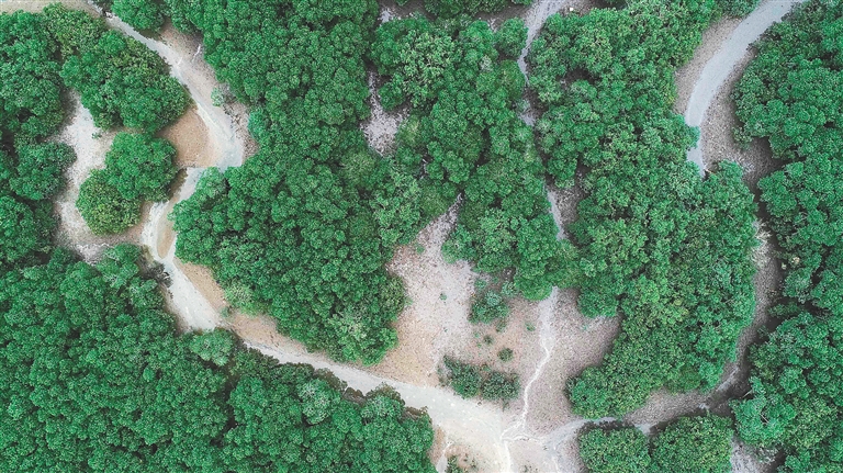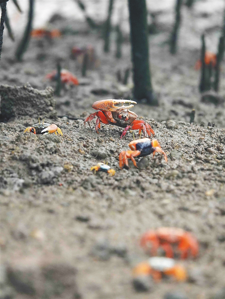 近日,在儋州市儋州湾红树林下,招潮蟹“大军”成群结队出没在滩涂上,十分壮观。近年来,儋州湾红树林得到较好保护,生态链逐步恢复,给海滩上的小动物带来了丰富的营养物质,使得此处成为招潮蟹“大军”的快乐天堂。
