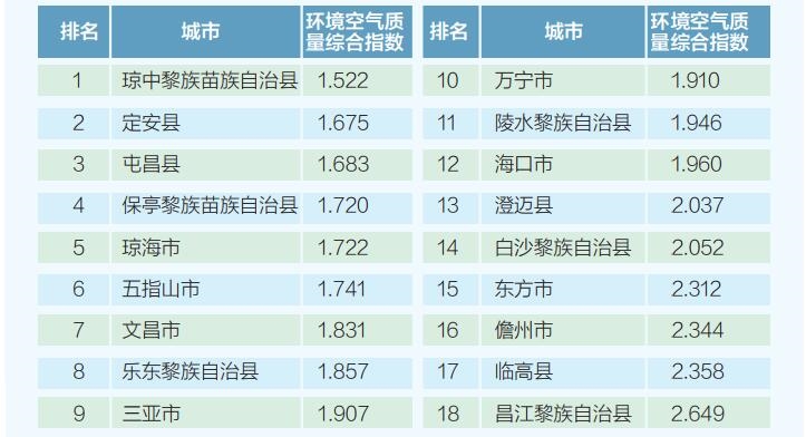 按照城市环境空气质量综合指数(以二氧化硫、二氧化氮、可吸入颗粒物、细颗粒物、臭氧、一氧化碳6项指标进行计算)评价,2019年3月,空气质量排名靠前的分别是琼中黎族苗族自治县、定安县和屯昌县,排名靠后的分别是昌江黎族自治县、临高县和儋州市。2019年3月全省18个市县(不含三沙市)城市(镇)环境空气质量排名如右: