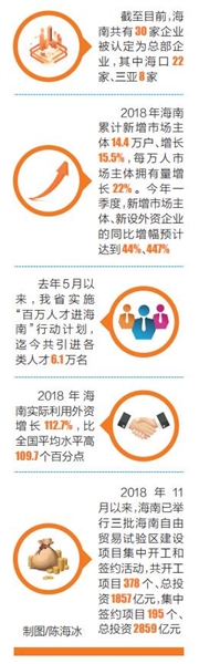 栽好梧桐树,引得凤凰来。据统计,2018年海南累计新增市场主体14.4万户、增长15.5%,每万人市场主体拥有量增长22%。今年一季度,新增市场主体、新设外资企业的同比增幅预计达到44%、447%。一批世界著名的公司和世界500强企业落户海南。去年5月以来,我省实施“百万人才进海南”行动计划,迄今共引进各类人才6.1万名。2018年海南实际利用外资增长112.7%,比全国平均水平高109.7个百分点。