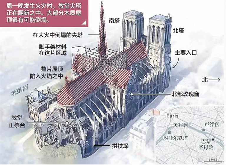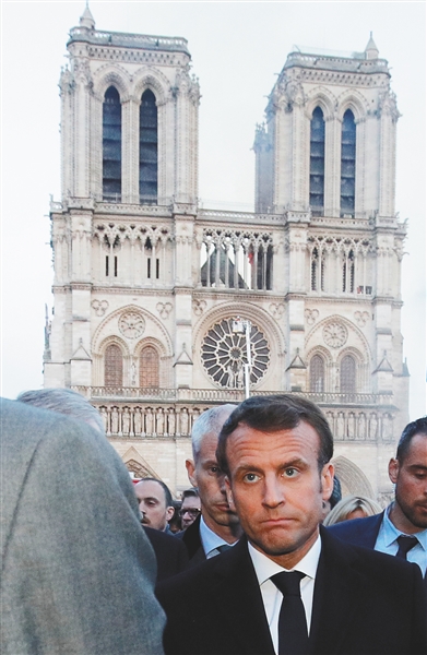 马克龙说,在巴黎各界、特别是500名消防员的奋力扑救下,巴黎圣母院的两个钟楼和正面建筑得到挽救,但三分之二的屋顶已被大火损毁,特别是标志性的塔尖已经倒塌。
