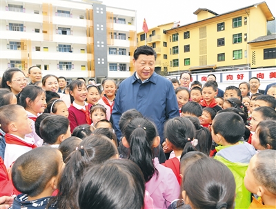 习近平首先来到中益乡小学。学校操场上,小学生们正在开展课外文体活动。看到总书记来了,学生们围拢过来,纷纷问习爷爷好,总书记高兴地同大家交谈,询问他们学习和生活情况。中益乡地处大山深山之中,群众居住比较分散,孩子上学是个难题。习近平指出,“两不愁三保障”,很重要的一条就是义务教育要有保障。再苦不能苦孩子,再穷不能穷教育。要保证贫困山区的孩子上学受教育,有一个幸福快乐的童年。习近平走进师生食堂,仔细察看餐厅、后厨,了解贫困学生餐费补贴和食品安全卫生情况。习近平嘱咐学校和老师既要当好老师,又要当好临时家长,把学生教好、管好。要把安全放在第一位,确保学生在学校学、住、吃都安全,让家长们放心。他希望老师们扎根山区,献身乡村教育事业,为群众脱贫贡献一份力量。