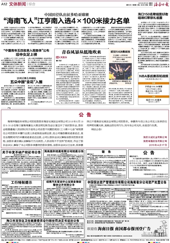 海南日报 文体新闻综合 012 2019-04-181 2019年04月18日 星期四