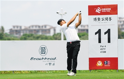 4月18日,2019中国男子高尔夫巡回赛博鳌公开赛在博鳌开赛。图为韩国选手李在元在首轮第11洞比赛中开球,首日比赛结束后,李在元以69杆低于标准杆3杆的成绩并列第6位。