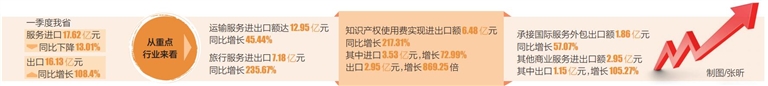 一季度占比较高的行业为运输、旅行、知识产权使用、其他商业服务、加工服务、电信计算机信息服务,进出口额合计32.78亿元,占服务贸易总额的97.11%。新兴服务进出口占服务贸易总额的33.52%,知识产权使用、商业服务、电信计算机和信息服务是新兴服务贸易增长的主要来源。