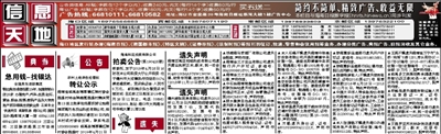 公告类信息:标题(字数在12个字以内),收费240元,内文(每行14个字)收费80元/行 商业广告:标题(字数在12个字以内),收费180元,内文(每行14个字)收费60元/行