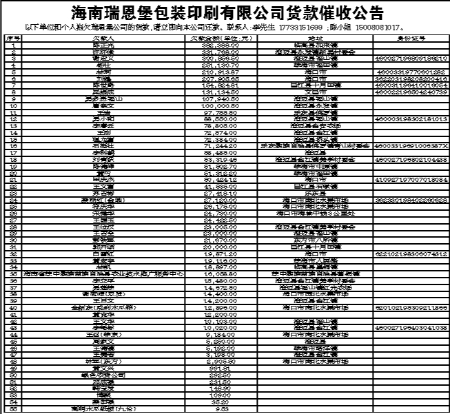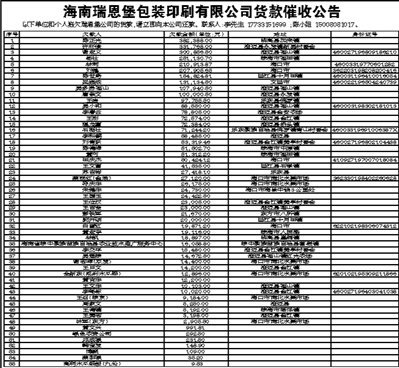 海南瑞恩堡包装印刷有限公司货款催收公告
