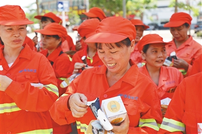 刚刚喝完绿豆汤的环卫工薛朝雷说,他当环卫工已有20多年,虽然工作很辛苦,但他明显感到社会对环卫工的尊重和关爱在不断加强,“每到酷暑高温时节,公司都会给我们准备降暑降温的饮品,每个月300元的高温补贴发放都很及时,经常有热心市民和企业给我们送饮料,让我们很感动。”