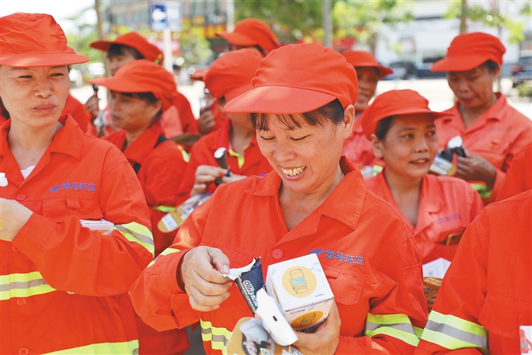 海口市园林和环境卫生管理局相关负责人介绍,针对近期高温天气,除了给环卫工人送去免费凉茶、绿豆汤,各区环卫公司都调整了保洁作业时间,由原定的6.5小时一班制调整为“3+3.5”工作制,将高温时间段错开成两班人员,减少职工在高温条件下连续作业时间,并加大机械作业力度,加强水车、机扫车、养护车降温降尘清洗路面的作业频率,降低人工保洁人员劳动强度,以保障环卫工人身体健康。