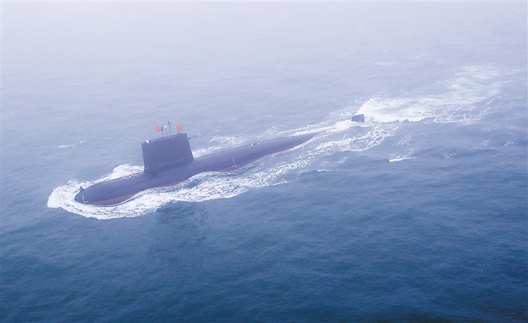 “大国重器”震撼亮相。首先接受检阅的是新型战略导弹核潜艇。在它带领下,其他7艘潜艇逐一通过检阅舰。