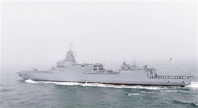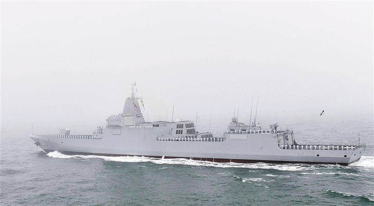 由国产新型万吨级驱逐舰南昌舰领航的驱逐舰群,踏浪而来,气势如虹。