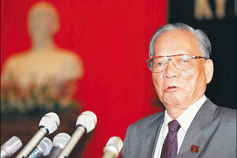 这是1997年4月2日拍摄的,时任越南国家主席黎德英在河内讲话的资料照片。 新华社/法新
