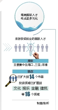 省委人才发展局提供的一份材料显示,随着一系列政策措施的出台,海南国际人才布点呈现多元化的趋势:来琼投资创业的国际人才原来主要集中在海口、三亚、洋浦,现在已逐步扩大到省内14个市县;投资领域也已扩展到文化、娱乐、金融、建筑等16个领域,正带动相关产业国际人才集聚。