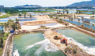 三亚实施铁炉港红树林自然保护区退塘还林(还湿)生态项目,改善生态环境,维护生态平衡和生物多样性。该自然保护区位于三亚海棠湾国家海岸旅游度假区内,不仅分布着丰富的红树植物种类,还保存有珍稀濒危物种,是较为完整的红树林湿地生态系统。此次清除工作涉及50个鱼塘、虾塘,共计约500亩。退塘后将种上红树,提升生态环境。