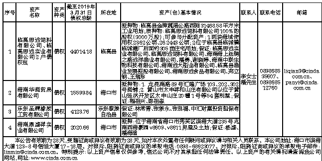 中国信达资产管理股份有限公司海南省分公司资产处置公告