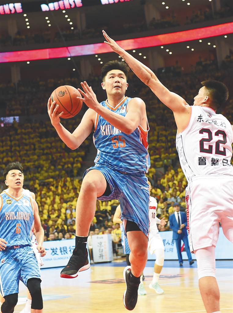 4月26日,在2018-2019赛季中国男子篮球职业联赛(CBA)总决赛首回合比赛中,广东东莞银行队主场142:123胜新疆广汇汽车队。图为新疆队球员孙桐林(中)在比赛中上篮。新华社发