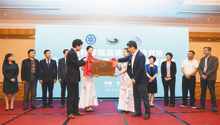 4月26日,在高海拔宇宙射线观测站科学观测启动暨天府宇宙线研究中心成立仪式上,嘉宾为天府宇宙线研究中心揭幕。记者从中国科学院高能物理研究所获悉,位于四川稻城海子山的高海拔宇宙线观测站(LHAASO)首批探测器日前正式投入科学观测。高海拔宇宙线观测站是我国“十二五”期间立项建设的国家重大科技基础设施,其主要科学目标为,探索高能宇宙线起源,开展相关的宇宙演化、高能天体演化和暗物质的研究。 新华社记者 金立旺 摄