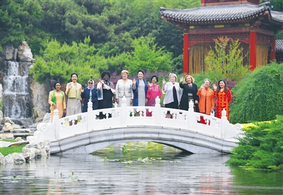 芳菲四月,绿草如茵。钓鱼台国宾馆丹若园内环池曲桥、亭台水榭,春意盎然。彭丽媛在入口处迎接来宾,同她们一一握手致意。丝竹声中,彭丽媛和来宾们共同步入园内,欣赏昆曲经典剧目《牡丹亭·游园惊梦》。彭丽媛向来宾们介绍昆曲的历史和文化特点,以及剧目所讲述的故事。华丽婉转的唱腔,悠长回荡的古乐,行云流水的舞步,得到来宾们高度评价。