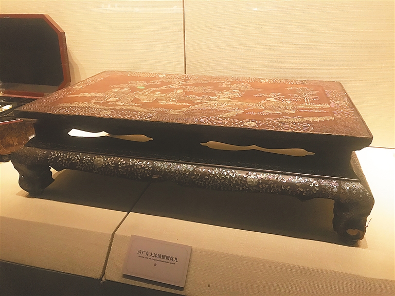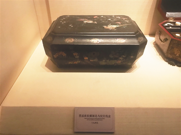 17世纪末期,以“广器”为首的中国漆器出口已经盖过日本所出产的“倭漆”,逐渐挤占了出口西方的漆器市场。18世纪30年代开始,东印度公司进口大量中国漆器贩运去欧洲,同时也往日本运去包括“广器”在内的中国漆器。南海博物馆的展览中,在漆器制品上也有一些原材料的使用,闪现着海南踪影,比如展品“黑漆嵌软螺钿花鸟纹针线盒”和“清广作大漆镶螺钿炕儿”,工匠在漆器上雕镂出花鸟纹样,再用贝壳镶嵌在镂空中,那种自然的五彩光鲜的贝壳纹理在黑色漆器的映衬下,显得格外精致、迷人。除了原材料的供给,具有一定规模数量的海南货、土特产,在那一时代,也是通过广州十三行进行了转销。