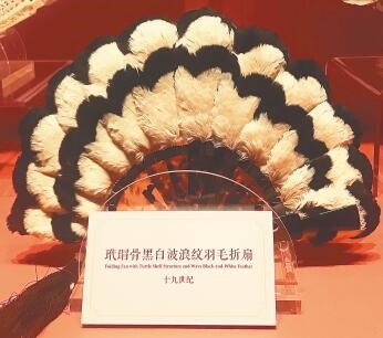 扇子在欧洲被女性视为必不可少的服装点缀品,价格昂贵,欧洲宫廷贵妇往往以拥有一把奢华精美的扇子作为炫耀攀比的资本。广州十三行的外销扇自然受到了欧洲贵妇的欢迎,这些外销扇材质名贵、工艺奇巧、纹饰华美、色彩绚丽,广州工匠将“广式”工艺与西洋审美相融合,使用象牙镂雕、玳瑁拉丝浮雕、累丝烧蓝、鹅毛彩绘、宝石镶嵌、鎏金错银等各种令人赞叹的制作工艺,创作出了大量中西风格共融、专供外销的扇子。在南海博物馆的展览上,十三行的精美扇子展出了数十把,其中,一件精致的贝雕骨羽绒折扇非常引人注目,这把扇子骨架都是由内壳材质制成,工匠们在打磨后的贝壳上进行二次精雕、镶嵌,贝壳扇骨本身洁白光润,加之精细的雕琢出花纹之后,脆而薄的贝雕扇就带有了天然的斑纹和华丽的色彩,更加栩栩如生,这样的贝壳扇骨架材料就有很多来自海南的原料供给。