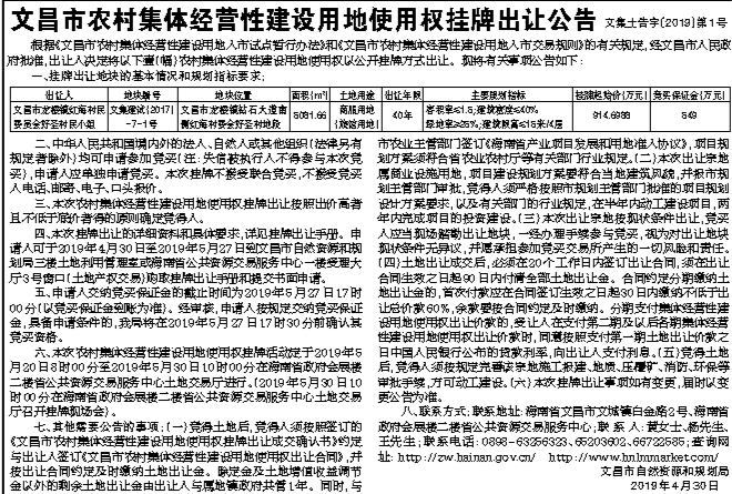 文昌市农村集体经营性建设用地使用权挂牌出让公告
