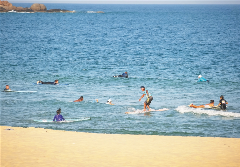 海滩为“纸”,海浪做“墨”,冲浪者尽情“作画”,4月30日,万宁日月湾,游客在海上学习冲浪,在浪尖跳跃、冲刺,展示矫健身姿,享受假日时光。