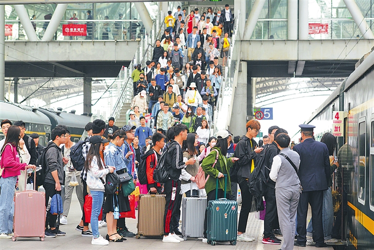 当日是“五一”假期的最后一天,各地迎来返程客流高峰。 新华社发(卢启建 摄)