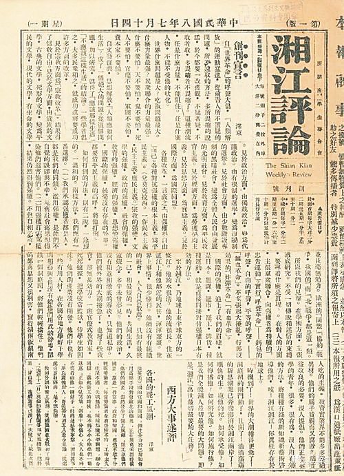 毛泽东一直站在运动的前哨,成为运动的积极组织者和领导者。为了开展湖南的革命运动,提高群众的政治觉悟,维护他们的革命热情,也为了发表自己的政见,湖南学生联合会和毛泽东觉得,在长沙办一个刊物很有必要。由此,1919年7月14日,《湘江评论》的创刊号出世了。“创刊宣言”由主编毛泽东亲自撰写,用较大一号的字排印,几乎占整个第一版的篇幅。这篇文章的立意新颖,热情奔放。在当时“世界革命”呼声和“人类解放”运动的影响之下,毛泽东曾写道:“世界什么问题最大?吃饭问题最大。什么力量最强?民众联合的力量最强……”