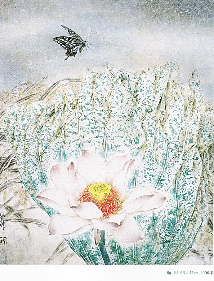 《工笔荷花一点通》书中《夏日清风2》画作,紫灰的调子,一朵荷花倾斜在画面中,显得厚重而温暖,染过白粉的花瓣,在尖部略施胭脂,淡淡的晕染开去,色彩由深至浅,显现出白里透红的丰庾。再据花瓣的走势细细勾出的脉络,丝丝分明,根根鲜活。极显画家用笔的功力是,线条流畅、圆润、饱满,又逆涩、苍老、劲健,展现了极高的勾画线条质量和水准。再看花瓣,错落相扶,各自展开,无一类同。花蕊是最精细描绘的部分,画家勾出一条条蕊心,分染层次,点上须头之后,荷花更有了精神。观看整幅画作,花朵风姿卓卓,吐蕊摇儀。在谋篇布局处理上,画家纵向地吸取了宋画技法的同时,又横向地借鉴了当代艺术发展中的表现形式,既有工整、沉稳、静雅的表达,又有灵动、飘扬、洒脱的笔意。重视表达天然荷花的气质、意态,画中花既是生活中的花,又不同于生活中的花。且掩映绰约,低吟浅唱,歌颂阳光的美好、生命的伟大。画面上的荷花宁静致远,祥和圣洁,画家的情怀一览无余,生活功底和造型能力可见一斑。