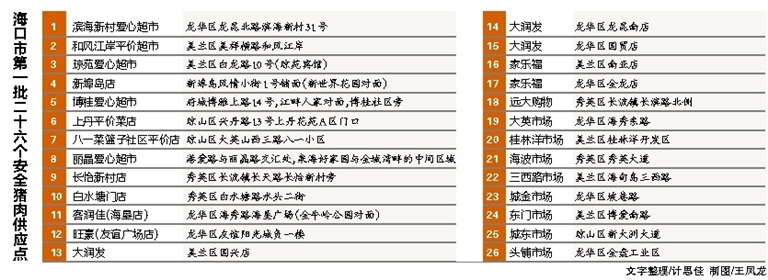 5月5日,海口已向市民开放第一批26个安全猪肉供应点,供应点还将陆续增加。据了解,放心猪肉门店点位经销商均是海口市相关部门在全市各大超市、农贸市场选定的符合条件的猪肉产品经销商,符合卫生条件好、信誉度高,没有违法违规记录等要求。