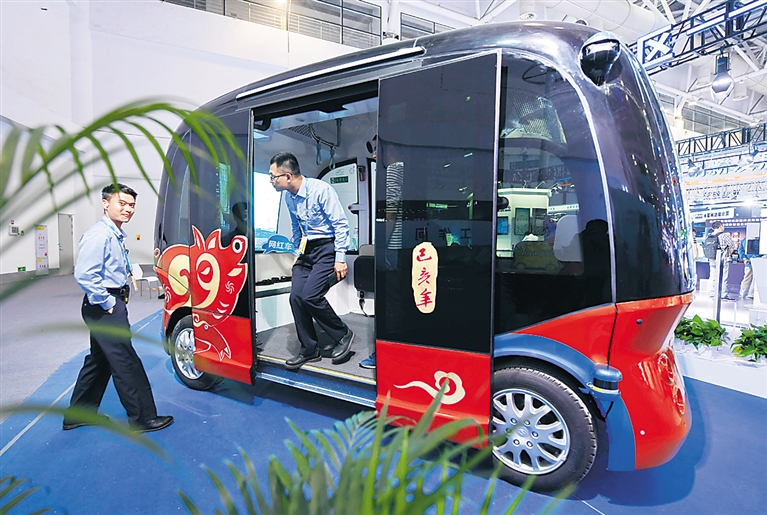 5月5日在第二届数字中国建设成果展览会上拍摄的无人驾驶汽车。