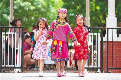 5月4日,在美国达拉斯市近郊普莱诺,来自新加坡的小朋友在亚洲节活动上展示特色服装。