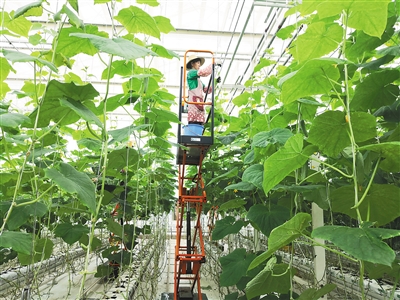 图为工人在桂林洋国家热带农业公园大棚内管理“水果黄瓜”。
