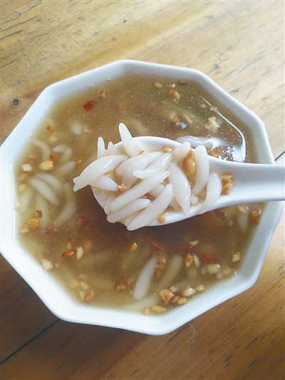 “搓粿仔的米粉不能直接用水和,要用生粉煮成的糊来调和,并且分量要把握好,不能多不能少,粉糊少了,粿仔硬,粉糊多了,又太软,容易粘牙。”钟秀萍边说着边忙着手中的活,只见洁白柔软的面团在她的手中变戏法似地成了一粒粒的小粉团,经双手合十一搓,“肚儿圆圆两头尖尖”的粿仔就成形了,随后“飞”到滚烫的开水锅里,搅拌几下就可以用漏勺打捞出来食用了。