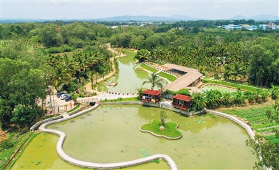 5月8日上午,在陵水黎族自治县提蒙乡远景村的鸭塘夜色农庄,荷塘中睡莲含苞待放,几只鸭鹅浮于绿波之上,岸边是黎族风情的亭台,好似一幅清雅幽静的美丽乡村画卷。