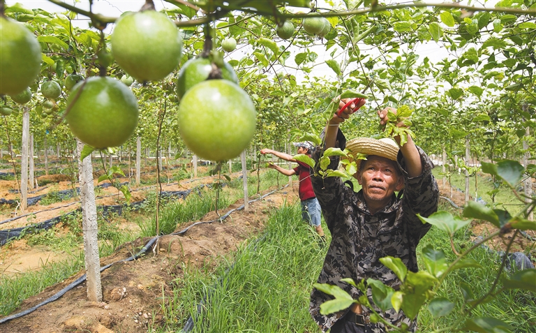 巍巍吊罗山山脚下,陵水黎族自治县本号镇白石村百香果基地内,一片60余亩的百香果园地生机勃发,细长的瓜藤上结着一颗颗圆滚嫩绿的百香果,工人们忙着修剪瓜藤,期盼着一个月后的第二轮收获。