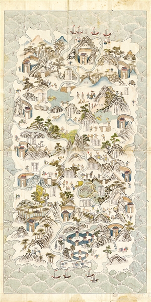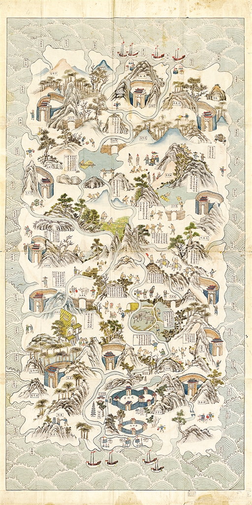 值得注意的是,晚清出现了一份清新奇特的立轴式全岛彩色舆图。无图名,无款识,上南下北,显示从府城方向眺望全岛,描绘了海南的主要山水、城邑、港口、营寨、炮台及船舶。其中,镶嵌了大量美丽风光、以黎族人为主的二三十帧风俗情景,以及对其习俗的多个小方文字说明。