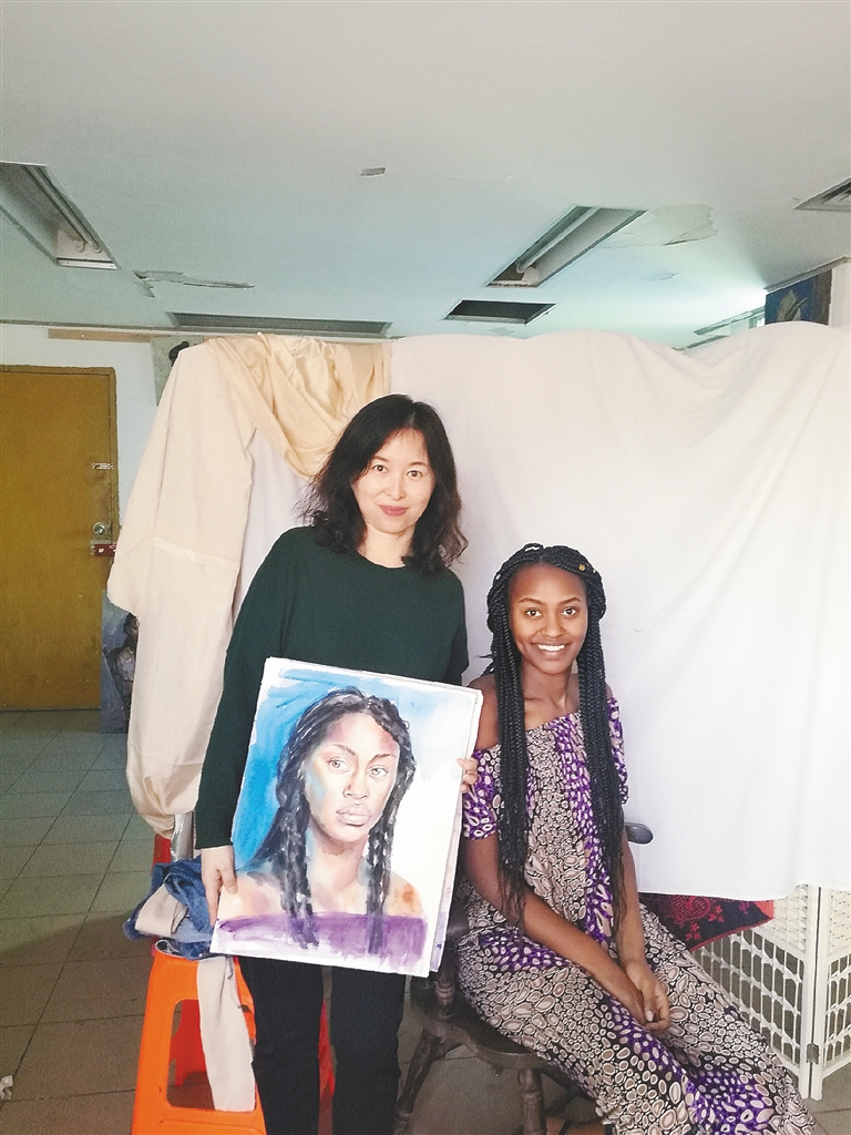 头上梳满小辫子的是埃塞俄比亚姑娘、用一层薄纱蒙在头上的是巴基斯坦姑娘、俄罗斯女孩美丽高挑释放青春靓丽……走进美琳画廊,一步一“美人”,各有各的美,令人赏心悦目。“这不是刻意的,但最后的结果却是我画的国际友人都是女生,她们真的好入画。”金晓曼笑吟吟地介绍道。