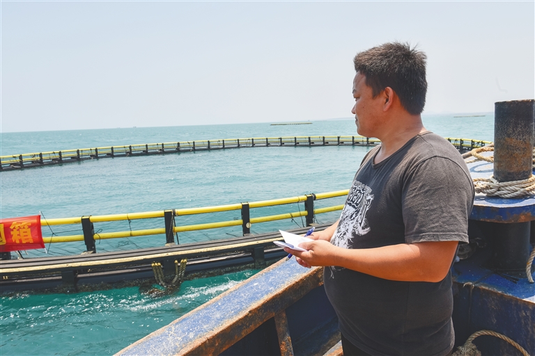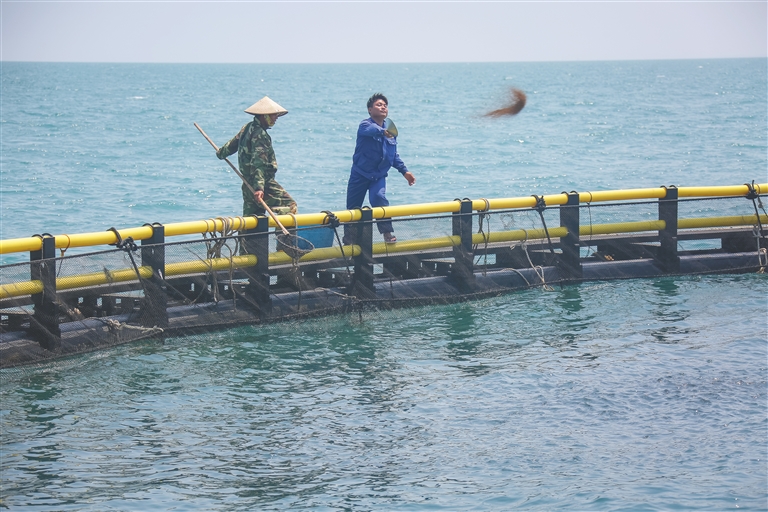 在海尾港海域,蔚蓝色的海面上盘浮着一个个圆形巨大网箱,成群的金鲳鱼在网箱中畅游。戴上草帽,穿上防水鞋……全副武装的刘炳裕和船员们乘船来到网箱边,为金鲳鱼喂食,并观察鱼儿的生长情况。他们奋力一扬臂,抛撒出的饲料很快落入网箱内,平静的水面瞬间便被争抢食物的金鲳鱼搅动起来。