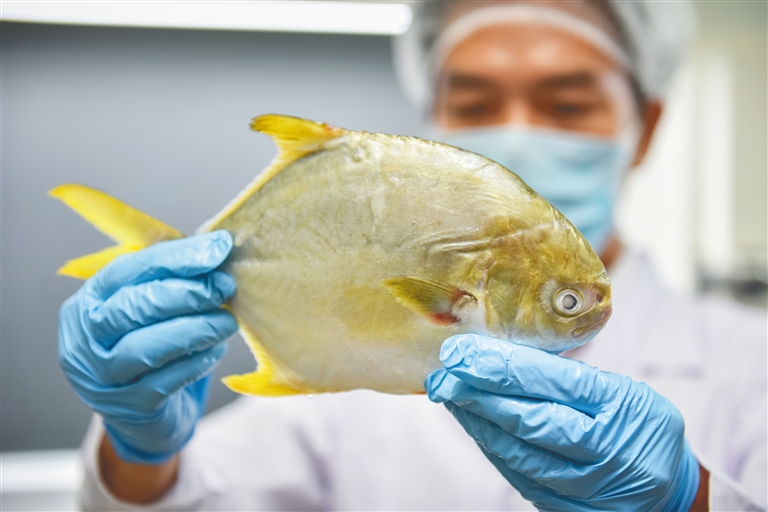 每年8月,成熟的金鲳鱼在捕捞完成后,会被运往检测中心进行抽检,完成兽药残留、感官检测、理化指标等多项检测,所有检测报告和数据也将在第一时间由检测人员写入区块链防伪溯源系统中,实现了产品生产的实时追踪。