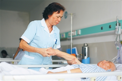“阿姨,听得到我说话吗?”董明霞俯身与其中一名患者打招呼。对方双目微睁,毫无反应。董明霞也习以为常了,她招呼护工一起为老人翻身,为其拍背、按摩,然后缓缓放平老人的身子,又接着查房去了。每一位重病患者她都会特别关照,同时也检查护士们的交班工作。