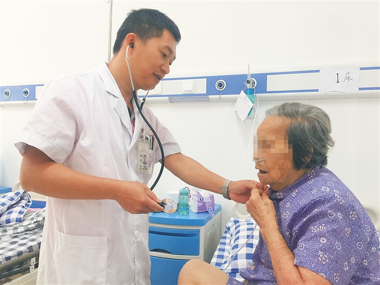 5月5日晚7时许,一名74岁的男性老年患者突然昏倒,被家人送至临高县中医院住院治疗。当晚11时半,老人出现持续不安,并且口吐白沫、尿失禁,生命体征出现不正常状况。老人立刻被紧急转移到抢救室,李海峰接到通知后马上赶到医院科室。“他迅速判断这种情况是急性心梗导致的,便马上使用抗凝药物和扩冠脉药物对症治疗,一个小时后,患者病情逐渐好转,烦躁消除,生命体征恢复正常。”陈雪红回忆道。