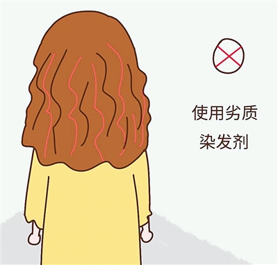 吴伟伟表示,染发的时候,要请技师尽量不要让染发产品接触到头皮和颈部,如果不慎沾到染发液,应立刻用水冲洗干净。在头皮有伤口时千万别染发,以免染发剂的化学物质通过伤口进入到血液中。染完发后,一定要多清洗几次。