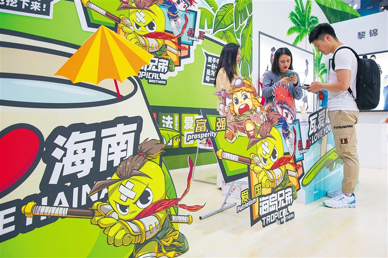 一改往年的静态设计,今年海南馆两侧入口均为大面积的LED屏幕,通过视频动态展示海南自然风光及文旅资源。“我们的整体设计造型用简单、明快、数字、板块式的设计语言,以文化、科技、旅游、数据、深度融合的展示手法,表达海南文旅融合的形象。”场馆总设计、深圳东方会展有限公司设计总监王起源介绍。为了凸显本地文化特色,团队深入海南各市县,选取12个文创项目在此集中展示。