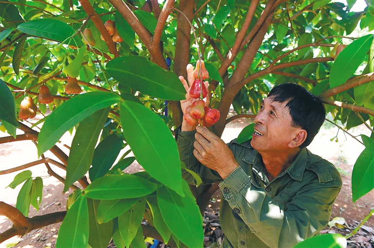 符圣明能够成为种植莲雾能手,离不开政府的帮扶。2016年,三江镇政府帮扶符圣明种植了8亩莲雾。为了让更多贫困户学到种养技术,三江镇当年开始举办扶贫夜校,邀请当地的莲雾种植大户王琼到夜校传经。此后,每周一晚,符圣明都会准时到夜校听课。