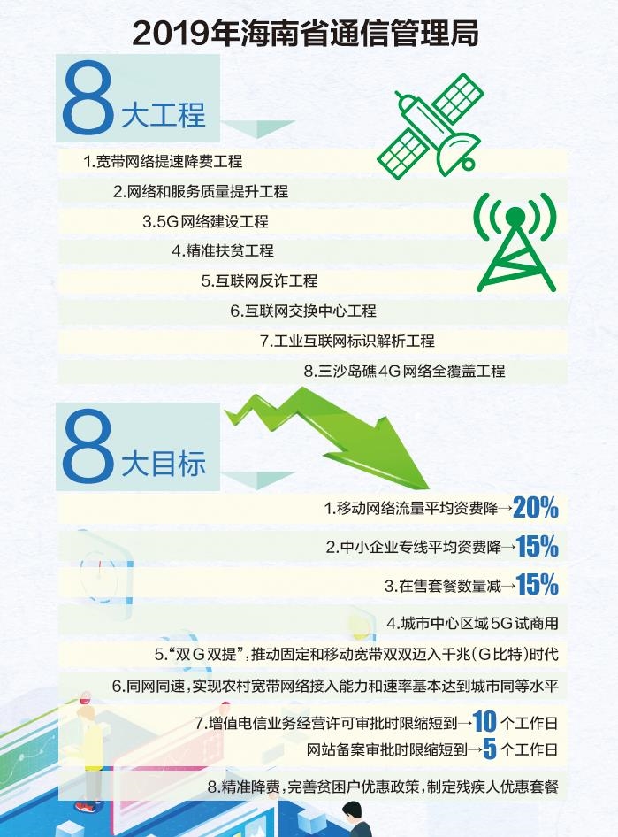 提速降费,打造通信普惠时代。“让利于民就是为民谋利”,2018年,用户月均移动流量平均资费降至7.3元/GB,降幅达64.3%;固定宽带平均资费比上年下降9.3%;互联网专线资费标准比上年下降超过10%。提速降费开展以来,海南通信行业通过取消移动电话国内长途及漫游费、移动流量“漫游费”等多项措施,使资费一路降低、网速不断加快,释放出实实在在的民生红利。