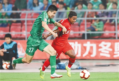 5月17日晚,在2019赛季中超联赛第10轮比赛中,北京国安队主场以2:1战胜天津天海队,豪取10连胜,继续以5分优势领跑积分榜。图为北京国安队球员王刚(左)和天津天海队球员雷纳迪尼奥拼抢。。新华社发