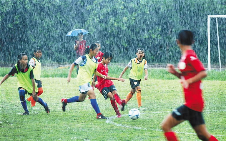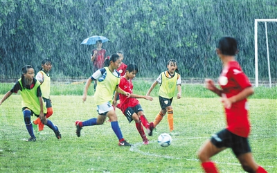 5月18日上午,琼中青少年足球队20名队员(男女各10名)在台湾参加了“2019海峡两岸青少年大武山杯足球交流赛”。比赛在屏东来义高级中学进行,当天天公不作美,绿茵场上大雨如注,在对阵屏东菁英足球队比赛中,琼中男足大比分失利。赛后,琼中男足11岁队员莫开奥说,今天比赛用球是4号球,比平时训练用5号球小,他们感到不太适应,发挥不好。在琼中女足对阵内狮小学比赛中,琼中女足表现出了较高水平,踢出了琼中女足的精神和风采。