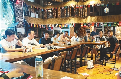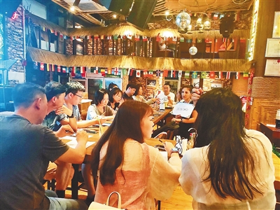 一个周末下午,在三亚大东海的欧亚非餐吧里,十多人围坐在一起,他们面前,南非籍外教Kareena(阮瑞娜)抱着一块白板,一边介绍接下来的活动内容,一边给大家发放纸和笔。